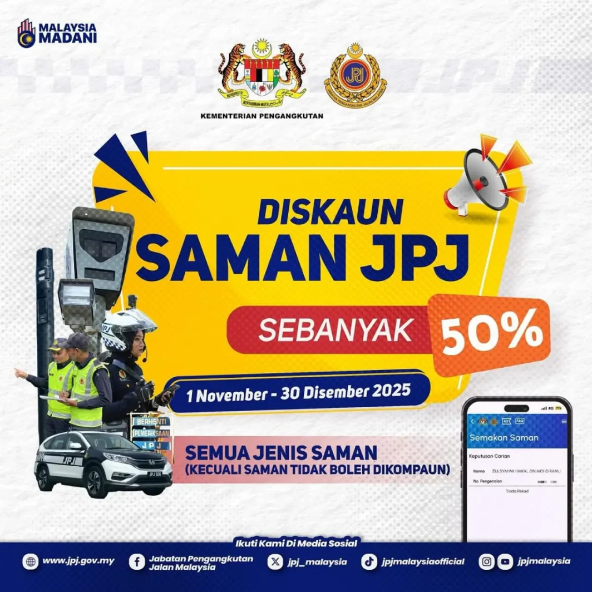 Kerajaan dari semasa ke semasa menawarkan diskaun saman trafik bagi menggalakkan penyelesaian saman tertunggak. Bagi tahun 2025, promosi diskaun saman melibatkan saman trafik PDRM dan JPJ telah diumumkan dengan kadar diskaun sehingga 70 peratus bagi saman polis dan 50 peratus bagi saman JPJ dalam tempoh tertentu. Maklumat rasmi berkaitan diskaun saman biasanya diumumkan melalui laman web PDRM di https://www.rmp.gov.my dan laman web JPJ di https://www.jpj.gov.my.
